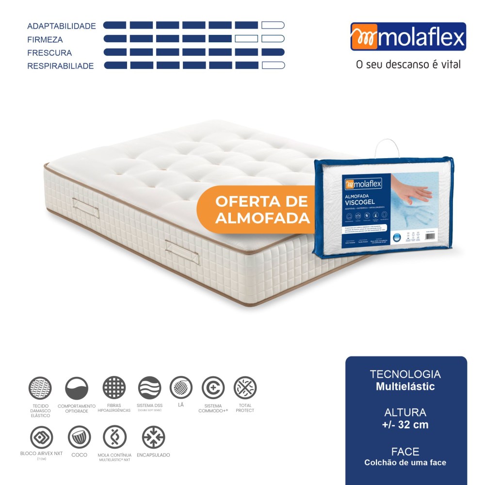 A espuma técnica Airvex® NxT (7 cm) constitui um bloco exclusivo com densidade superior ao padrão, concebido para otimizar o desempenho do núcleo. Esta espuma proporciona maior adaptabilidade, flexibilidade, suavidade e durabilidade. Inclui vários canais que permitem uma ventilação natural. O bloco fabricado em molde apresenta diferentes zonas de firmeza. Dispõe ainda de uma camada de fibra compacta termo ligada com látex (coco), que combina resistência e elasticidade. A mola contínua Multielastic®, tecnologia exclusiva da Molaflex® aplicada na camada nove, garante o comportamento perfeito do colchão na adaptação ao corpo, ajustando a firmeza e o suporte em função da pressão exercida.