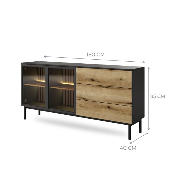 A coleção Lang é feita de madeira de carvalho natural combinada com preto contrastante, que é adicionalmente enriquecida com iluminação LED quente e lamelas em uma placa HDF atrás de frentes envidraçadas de vidro colorido, o que cria uma aura mágica. Além disso, as alças tradicionais foram substituídas por um conveniente sistema sem alça push-to-open. O conjunto Lang foi criado para quem valoriza móveis interessantes, originais e atraentes.