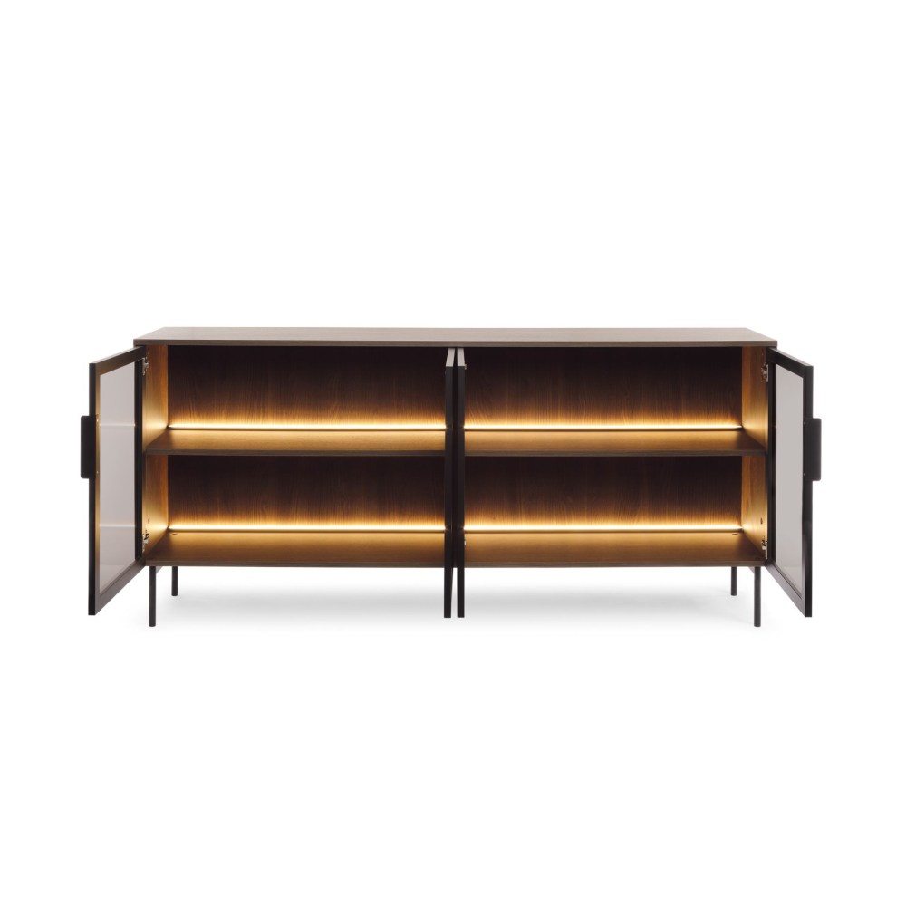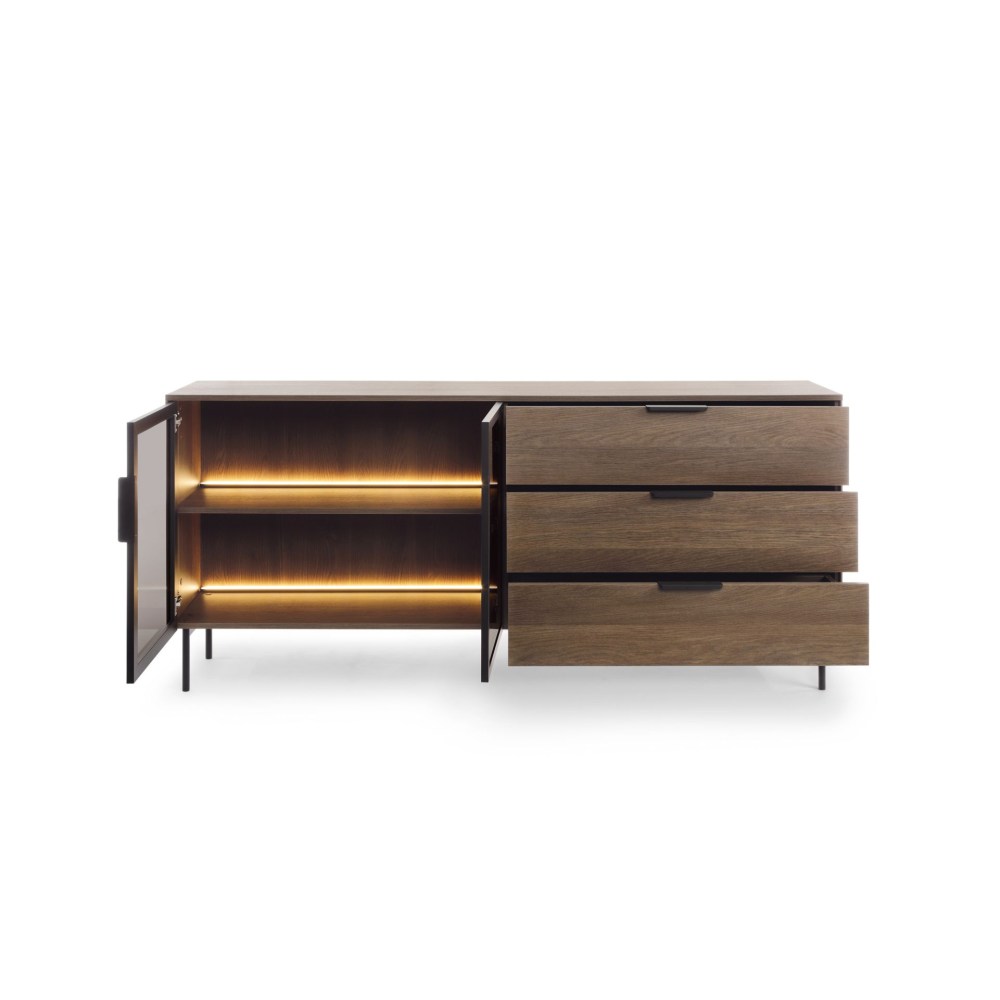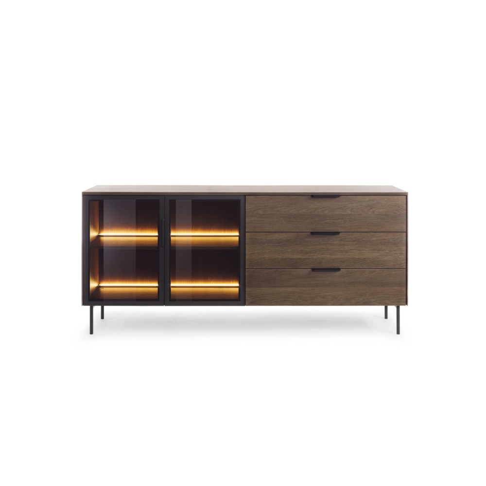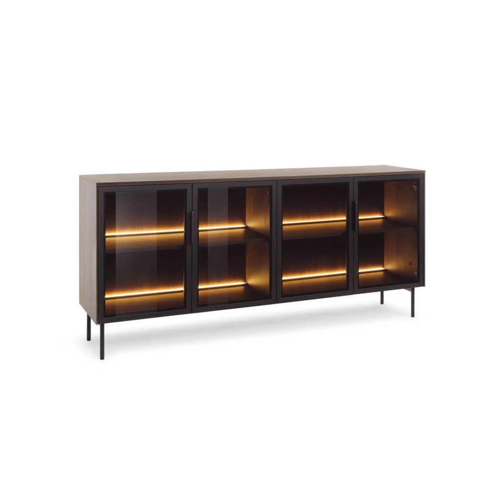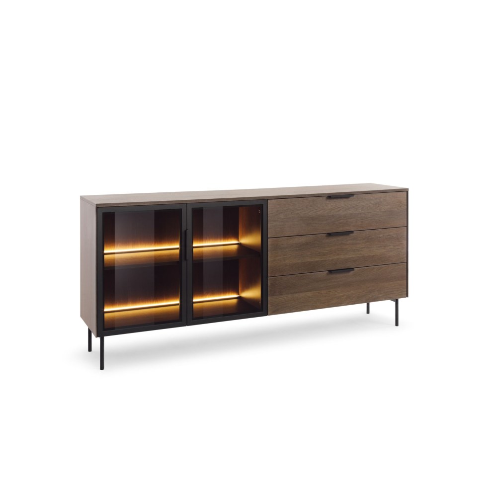 Lumi em Carvalho Dunin é uma opção elegante e funcional. Seu design exclusivo torna a coleção não apenas uma peça de mobiliário esteticamente agradável, mas também uma solução prática de armazenamento, conferindo um toque pessoal a qualquer ambiente. As frentes de vidro temperado protegem o conteúdo dos armários contra poeira e danos, permitindo que você exiba seus itens favoritos. Pés e puxadores de metal preto adicionam um toque de leveza ao móvel, enquanto a iluminação cria uma atmosfera aconchegante.