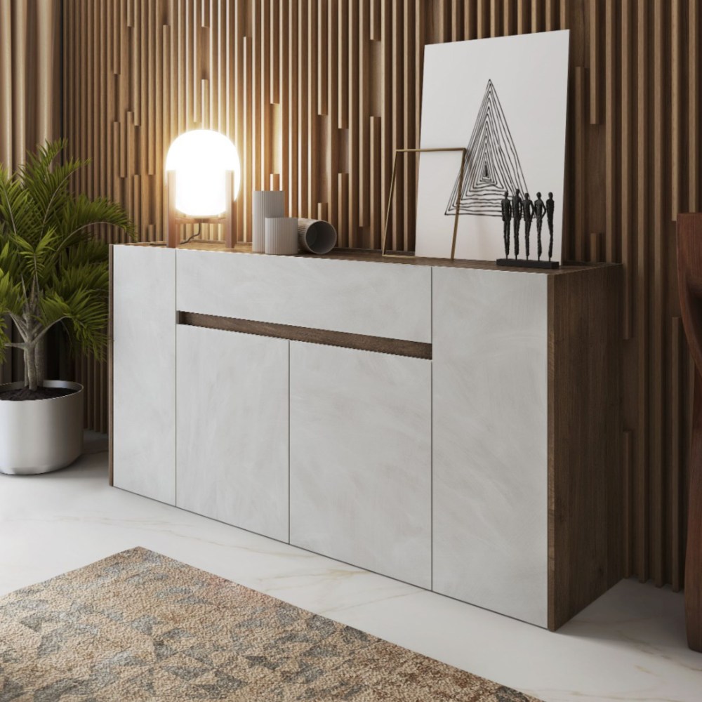 Com compartimentos de armazenamento bem projetados, este aparador oferece espaço amplo para organizar e guardar itens essenciais, mantendo o ambiente arrumado. E com uma generosa extensão, este aparador fornece uma superfície espaçosa para exibir itens decorativos, fotografias e elementos pessoais.
