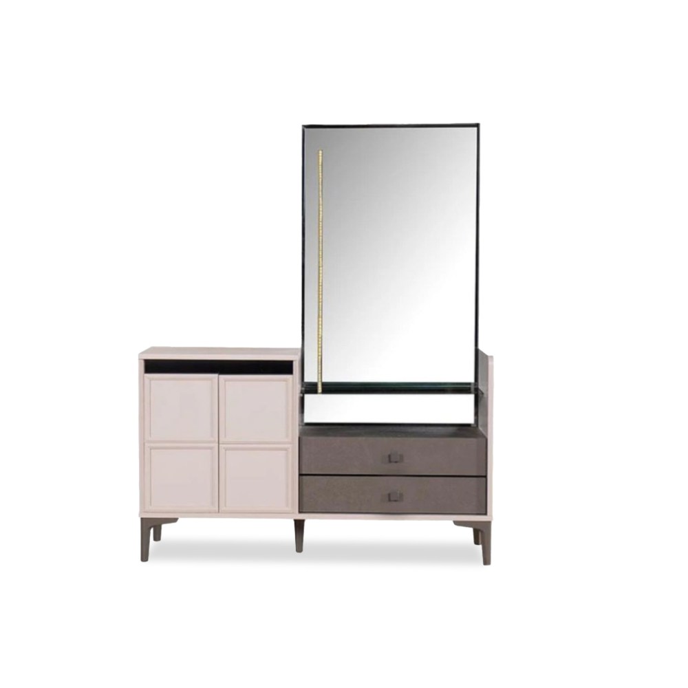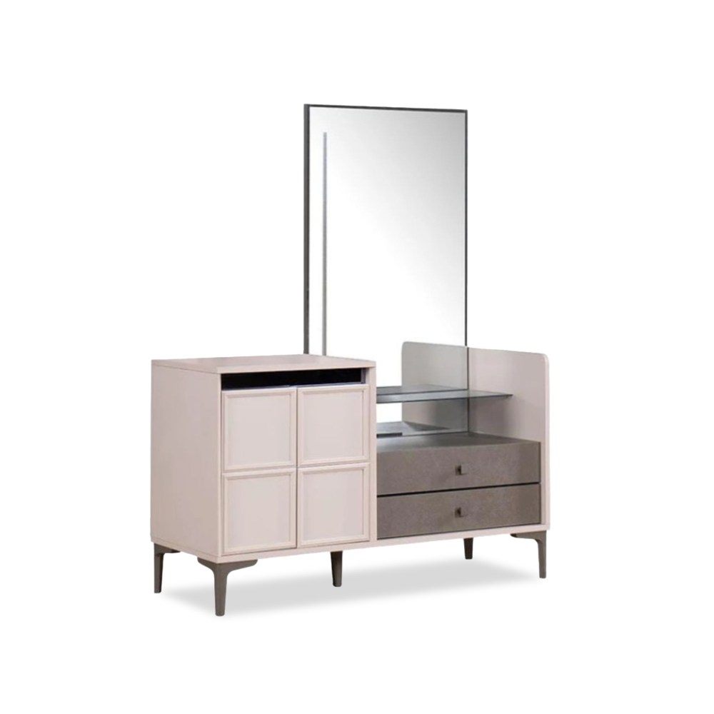 Os detalhes espelhados na penteadeira e no guarda-roupa de Melina fazem a diferença tanto em termos de facilidade de uso quanto de estética.