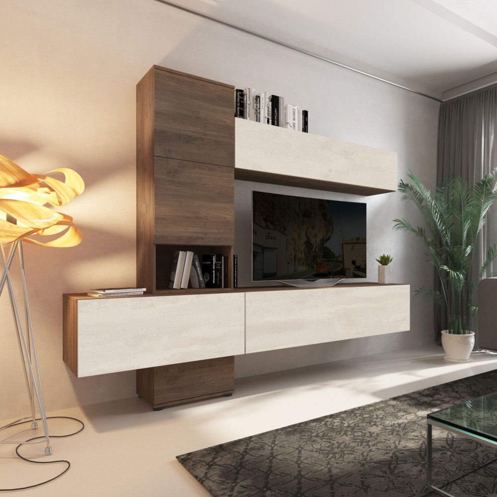 Esta estante para TV com módulos suspensos não apenas oferece espaço de armazenamento prático, mas também é uma peça de destaque na sua sala de estar, adicionando estilo e personalidade à sua decoração.