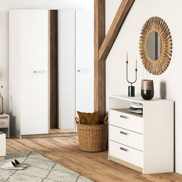 Roupeiro moderno e elegante, com linhas retas na cor branca e cor de carvalho.